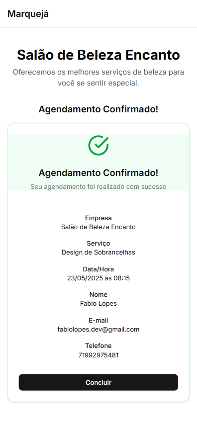 Seus clientes podem agendar através de um link personalizado que você pode compartilhar em suas redes sociais, site ou enviar diretamente por mensagem. O processo é simples e intuitivo.