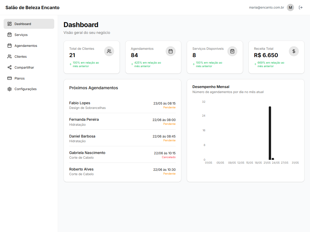 O dashboard me ajuda a planejar melhor minha equipe e estoque. Consigo ver quais são os serviços mais procurados em cada período.